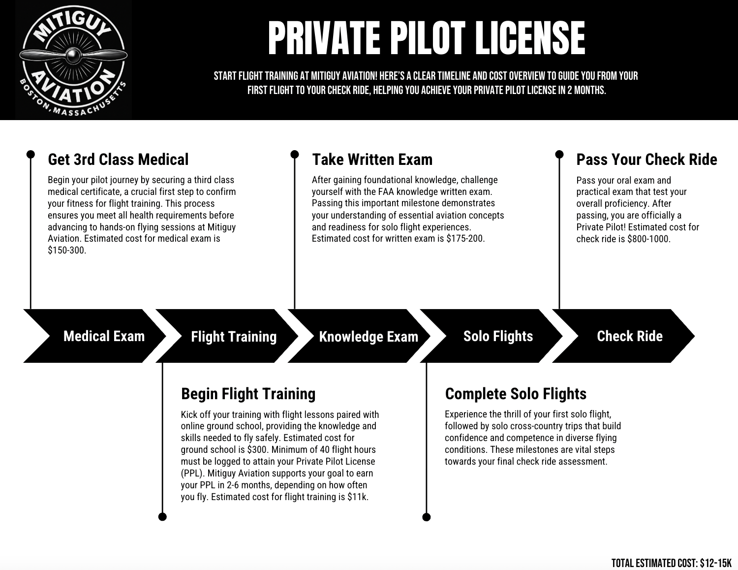 At Mitiguy Aviation, we offer an accelerated PPL program that can get you certified in as little as 2 months.